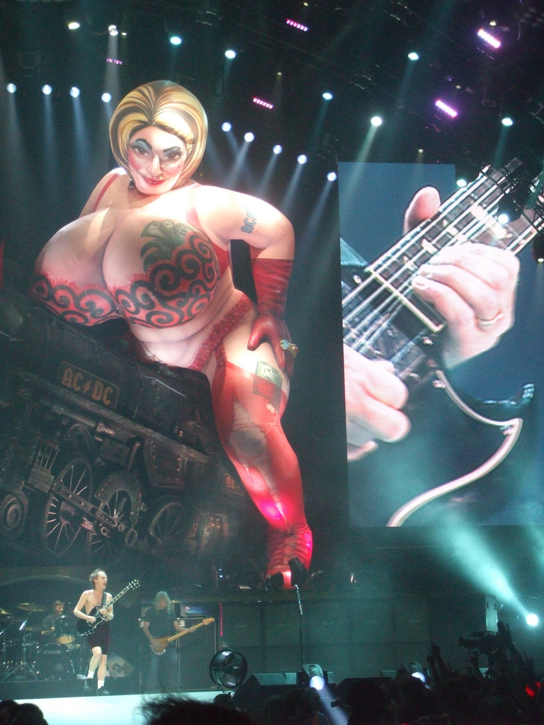 Llega el blues en su estado más puro con “The Jack”, Angus highlight, striptease, locura general, cervezas derramadas, cuernos rojos, ya sólo nos quedaba tocar las campanas en ese infierno, y Brian Johnson nos ayuda colgándose a una monstruosa campana sobre el escenario, es “Hells Bells”, y como si de balas en el cargador se tratasen “Shoot the thrill”, apoteósica al igual que “War Machine” y “Anything Goes”. Las notas ya se nos clavaban en nuestros cerebros como astillas, el volumen era brutal, la traca final estaba llegando y de nuevo los riffs de “You Shook Me all night long” y “TNT”, aparece Rosie, una muñeca inflable de 25 metros de alto, la historia del encuentro de Bon Scott con una prostituta, medias y corsé rasgados sobre el escenario, “Whole lotta Rosie” y “Let There Be Rock”, se termina el concierto y maratón de Angus toda la noche con su clásico duck walk de Chuck Berry, el encore final era para su cumpleaños y para todos nosotros, “Highway To Hell” y “For Those About To Rock”.