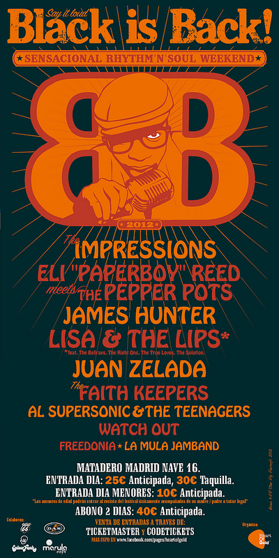Legendary The Impressions, of course without Curtus Mayfield, but with Fred Cash and Sam Gooden, Lisa Kekaula (The Bellrays), James Hunter y Eli “PaperBoy” Reed & The Pepper Pots, with local bands such granadinos Al Supersonic & The Teenagers, Juan Zelada, Watch Out, Freedonia and La Mula Jamband. Tickets for 2 days 40 euros.