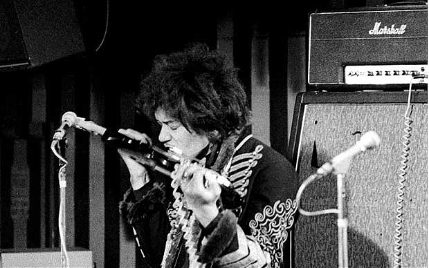 Jimi Hendrix mordiendo su guitarra Fender, detrás los amplificadores Marshall