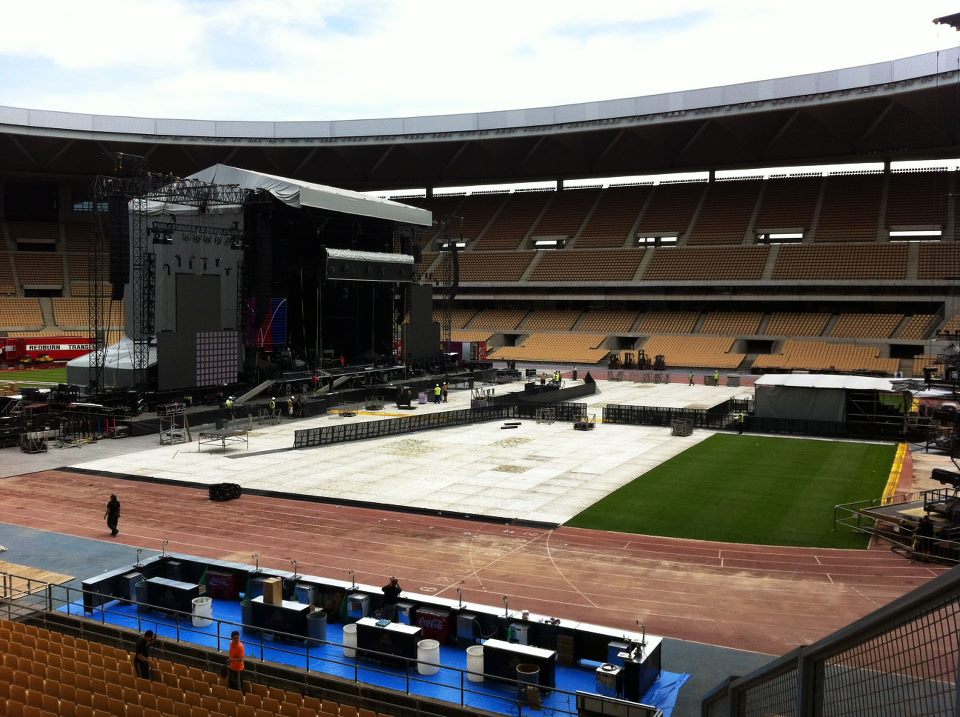 28 camiones transportarán el escenario y unas 120 personas trabajan para el montaje del mismo en cada ciudad.