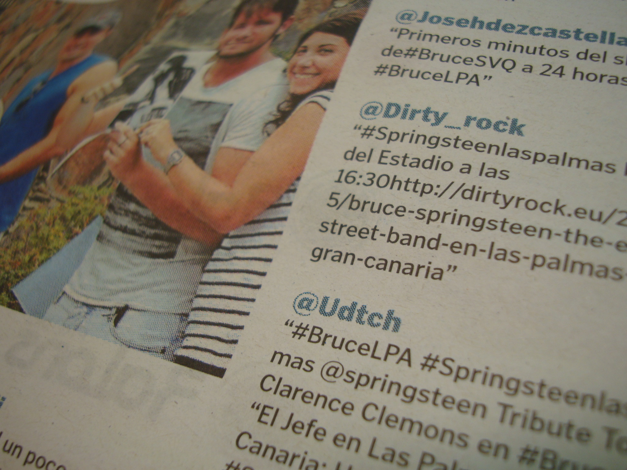 Canarias 7 y La Provincia también se han volcado con el evento. En la cola de entrada al concierto, formada desde primeras horas de la mañana para poder acceder al Pit, Canarias 7 regaló la edición del sábado 12 de mayo de su revista C7 con un especial Bruce Springsteen en las páginas centrales en papel satinado de muchos gramos por metro cuadrado. El diario dedica al evento 9 páginas de su edición de hoy, y en Internet se puede disfrutar de una galería de 81 fotos por Arcadio Suárez, Juan Carlos Alonso y Fernando Ojeda: de la prueba de sonido (fotos 46 a 59), aledaños (60 a 81 excepto 77) y el concierto (fotos 1 a 45, y 77). De Fernando Ojeda son estas otras fotos de Bruce en el coche.