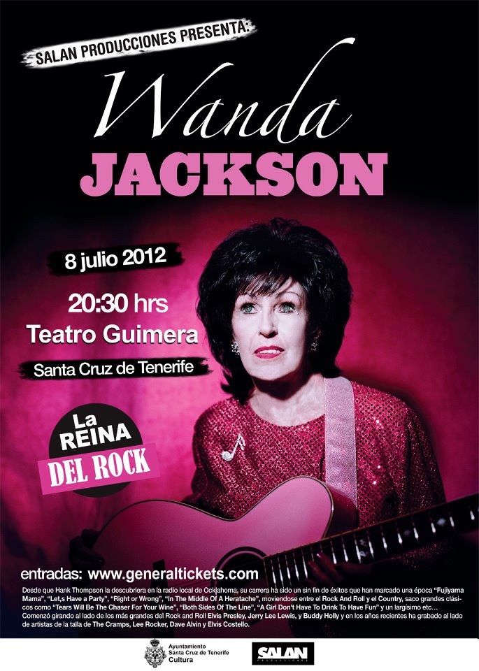 Ella es Wanda Jackson, sinónimo de fiesta y Rock & Roll, oportunidad única para presenciar a la “Reina del Rock and Roll” en directo en Tenerife y las Islas Canarias, ya podemos morir tranquilos, la nobleza y aristocracia del Rock and Roll de verdad ha visitado Canarias, Chuck Berry el generador de todo y gran pionero del género visitó Las Palmas y Tenerife en aquellos históricos conciertos del 27 y 28 de marzo de 2008.