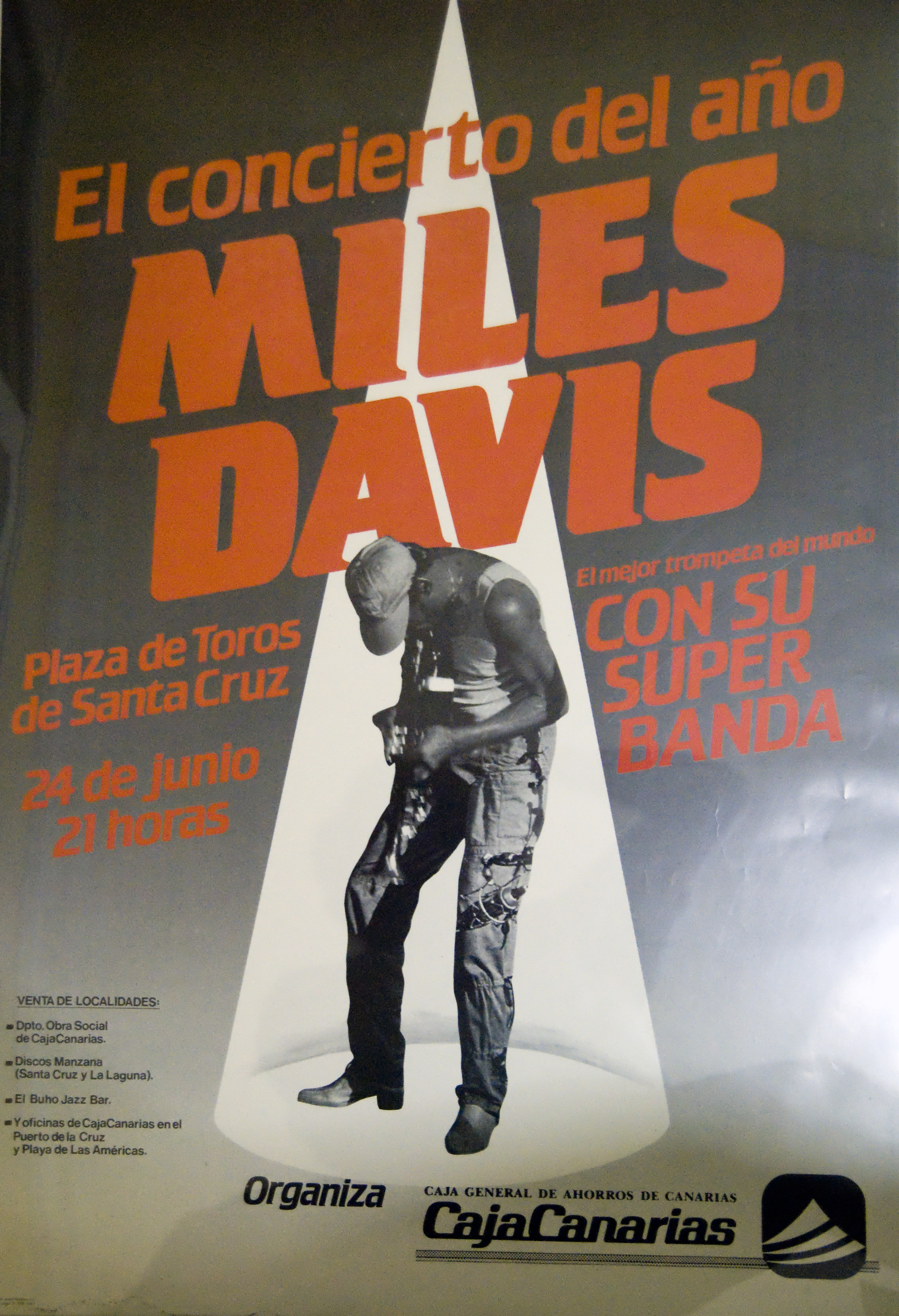 En Dirty Rock queríamos contar con una voz cualificada en el mundo del Jazz en Canarias, Felipe Díaz Reyes para que nos comentase algo sobre Miles Davis, qué mejor momento que recordar su primera visita a Canarias, de las dos que hizo a las islas, (en la otra visita de Miles Davis a Canarias en 1989 el bajista fue Benny Rietveld), esta primera un miércoles 24 de junio de 1987 en la Plaza de Toros de Santa Cruz de Tenerife con su Super Banda como recogía el póster del evento, gentileza también de Felipe Díaz Reyes, Director del Aula de Jazz y Música Actual de la ULPGC (Universidad de Las Palmas de Gran Canaria) y colaborador de Cuadernos de Jazz. Ahí lo tenéis: