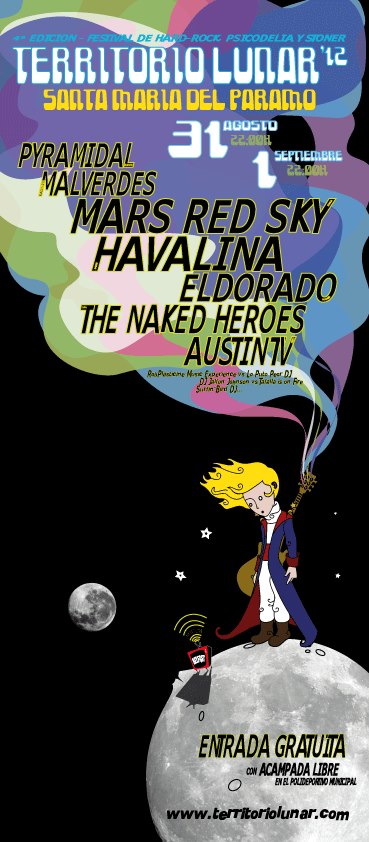 En esta edición del Festival Territorio Lunar 2012 participan el viernes 31 agosto, Los Malverdes, Havalina y The Naked Heroes, y el sábado 1 de septiembre Pyramidal, Eldorado y Mars Red Sky. Se cae del cartel Austin TV, por causas ajenas a la organización, la entrada es gratuita al certamen.