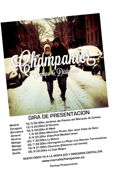 Marcelo Champanier, el bonaerense con el alma en llamas y auténtico Rockero de a pie de calle, vuelve con un genuino discazo “Tiempo y Distancia”, publicado el pasado mayo de 2012 con una nómina de cómplices, realmente apabullante (Claudio Gabis, Ariel Rot, Candy Caramelo, Laura Rubio, Charlie Cepeda, Litus, Vikxie, Luca Frasca, Mac Hernández, Lea Aput, Toni Jurado, Perro Flaco, Pepe Curioni, Fernando Martín, Norman Hogue, Carmen Hernando, Sergio Makaroff, Juan Mari Montes o el ingeniero de sonido Guido Nisenson.