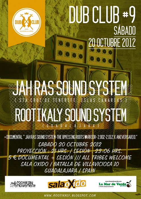 • Guadalajara, 20 de octubre, Sala Oxido, novena edición del Dub Club Guadalajara, Dub Club# 9, con la proyección del documental “Jah Ras Sound System. The Uprising Roots Warrior. Décimo Aniversario”, a partir de las 21 horas. Tras la proyección encuentro Rootikaly Sound System y Jah Ras Sound System desde las 23 horas hasta las 5 de la madrugada.
