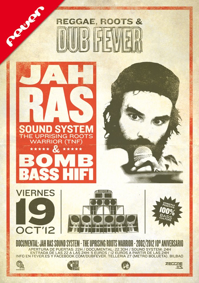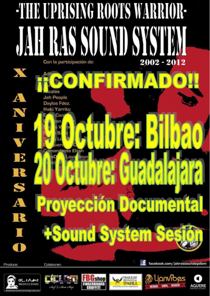 • Bilbao, 19 de octubre, Sala Santa Ana 27, proyección de “Jah Ras Sound System. The Uprising Roots Warrior. Décimo Aniversario” a partir de las 22 horas. Tras el documental encuentro Bomb Bass Hi–Fi y Jah Ras Sound System, con una sesión de larga duración a lo vieja escuela hasta las 5 de la madrugada.