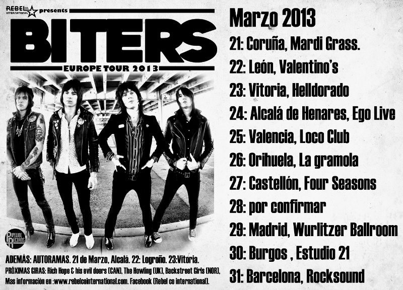 Biters estarán en Italia con conciertos entre el 2 y 7 de abril de 2013, y de ahí a Francia,Alemania y Reino Unido.