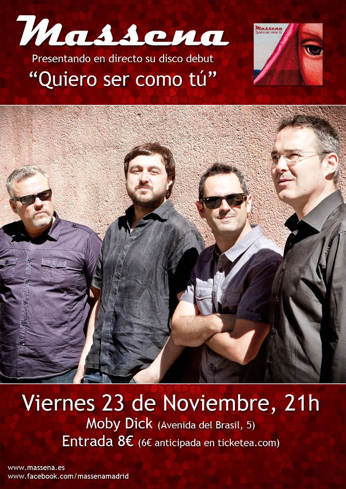 Massena es un extraordinario grupo nacional que saborea las mieles del Rock, el Country, Folk y Blues como pocos, tienen nuevo disco “Quiero ser como tú” y lo presentan el próximo viernes 23 de noviembre, a las 21 horas en Madrid, sala Moby Dick. Hace apenas unas semanas abrieron para Blue Rodeo su concierto en Sevilla.