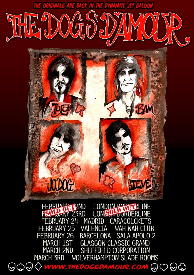 With songs like “Trail of Tears”, “Victims of Success”, “I Don’t Want You To Go” and “How Come It Never Rains”, it’s no wonder that bands like Hunter/Ronson took them out on tour.The Dogs D’Amour will reunite for a select number of gigs and festivals in 2013 to perform all The Dogs hits and classic favorites along with several new songs they’re currently recording.The kickoff gig and fund raiser charity event will take place on February 22, 2013 at The Borderline in London, England.