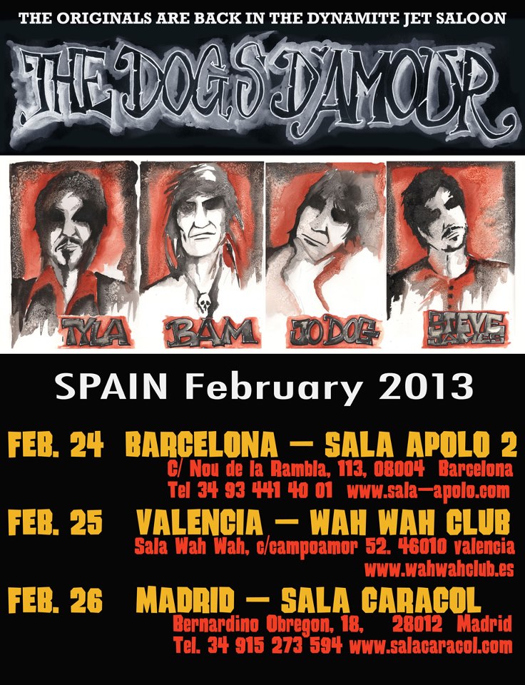 The Dogs D’Amour, celebrarán el 25 aniversario de su memorable disco “In the Dynamite Jet Saloon”, con una seri de conciertos, uniéndose la formación que grabase el disco y fuese más estable, para recaudar dinero para un músico amigo de la banda aquejado de cáncer, las primeras fechas confirmadas son dos conciertos en Londres (The Borderline) 22 y 23 de febrero, Barcelona (Sala Apolo) 24 febrero, Valencia (Wah Wah Club) 25 febrero y Madrid (Sala Caracol) 26 de febrero, Glasgow (Classsic Grand) 1 marzo, Sheffield (Corporation) 2 marzo y Wolverhampton (Slade Rooms) el 3 de marzo de 2013.