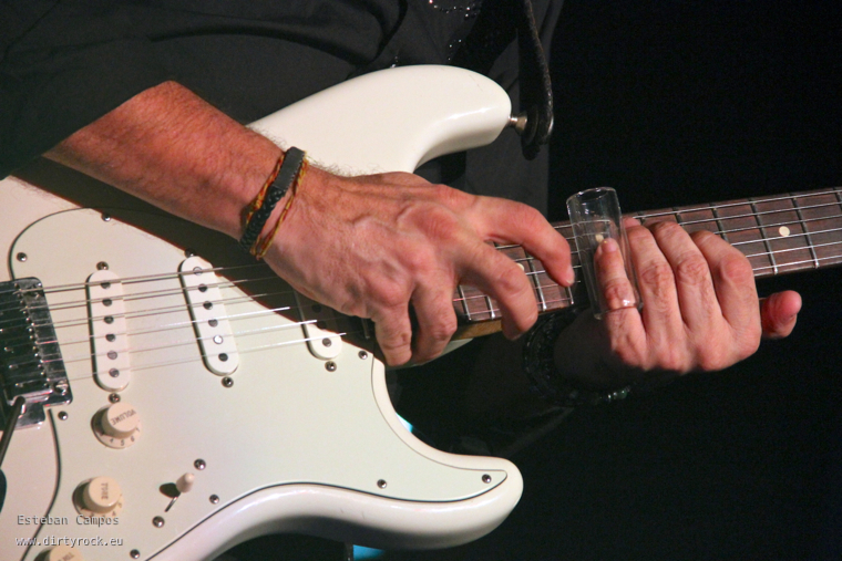 La sala completó totalmente su aforo (circunstancia que no es muy habitual en estas tierras) para disfrutar del que para muchos ya se ha convertido en un músico de culto, en un guitarrista sin fronteras que ha sabido fusionar el Blues con otros estilos musicales, creando su propia “marca” a las 6 cuerdas. La iluminación fue óptima y la banda sonó exquisitamente.