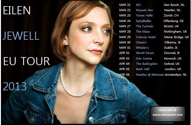 Eilen Jewell comienza el jueves 21 de marzo su gira europa que la llevará por Holanda, Suiza, Alemania, Inglaterra e Irlanda, en la que estará acompañada por su marido y melómano batería Jason Beek (Whoa! Man! Jesus!) , Johnny Sciascia (The Spurs y The Crank-Tones) (contrabajo) y Jerry Miller (The Spurs) (guitarra).