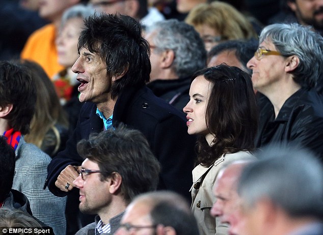 Ronnie Wood y su esposa, la actriz y modelo Sally Humphreys, presenciaron ayer 12 de marzo en el Nou Camp de Barcelona el encuentro de octavos de final entre el F.C. Barcelona y el A.C. Milan, que se dilucidó con un resultado de cuatro a cero para el conjunto blaugrana.