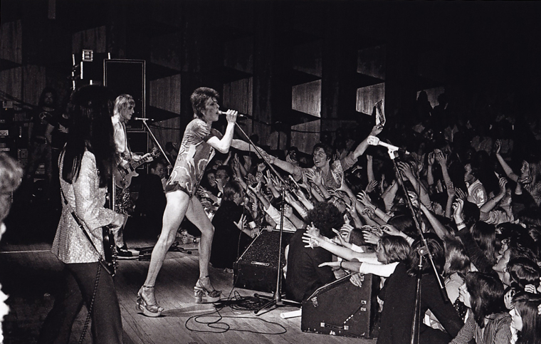 “La fotografía fue tomada en el verano del 73 en el última gira de Ziggy Stardust (“todos los fans quieren algún trozo de mí”). En ése momento Bowie quería estar físicamente cerca del público. En 1972 el público estaba más pasivo, más hipnotizado, pero del final de la gira de 1973 tengo una buena cantidad de fotografías de él tocando a la gente, siendo manoseado por el público, chicos corriendo por el escenario, agarrados a él. Hay algo especial en ésta foto, en particular que la gente ama (el largo arco resultante cuando el chico es levantado por encima de la gente) Ziggy y la gente estaban intentando conseguir que lo que se puede ver en la foto fuera realidad, es el punto culminante, con sus altas plataformas y la camisa japonesa. Ziggy está realmente perfecto”