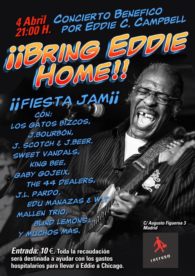 Eddie C. Campbell, importante Bluesman norteamericano de la escena del West Side de Chicago y pionero de ese movimiento, recibirá concierto tributo el próximo jueves 4 de abril en la sala El Intruso de Madrid, denominado ¡¡Bring Eddie Home!!, para recaudar fondos para pagar los costes médicos en su país debido a un infarto y derrame cerebral que sufrió el pasado mes de enero con la parte derecha de su cuerpo paralizada.