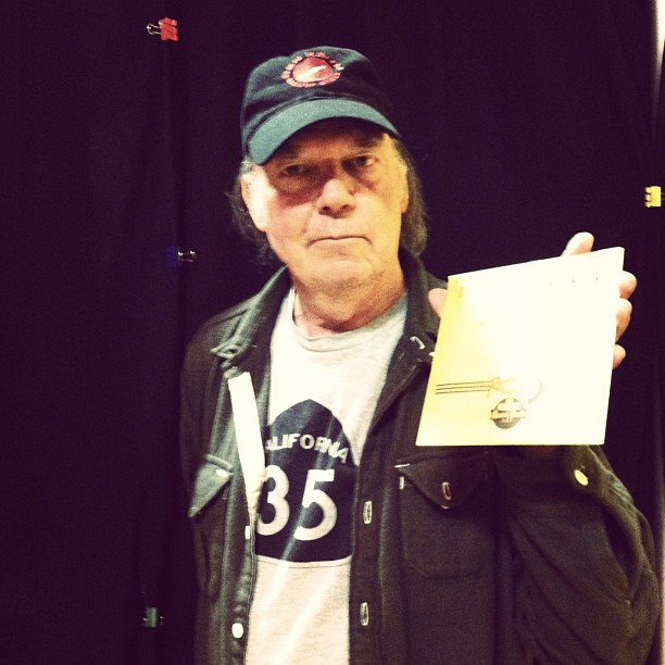 Neil Young con su copia del vinilo tras grabar una canción.