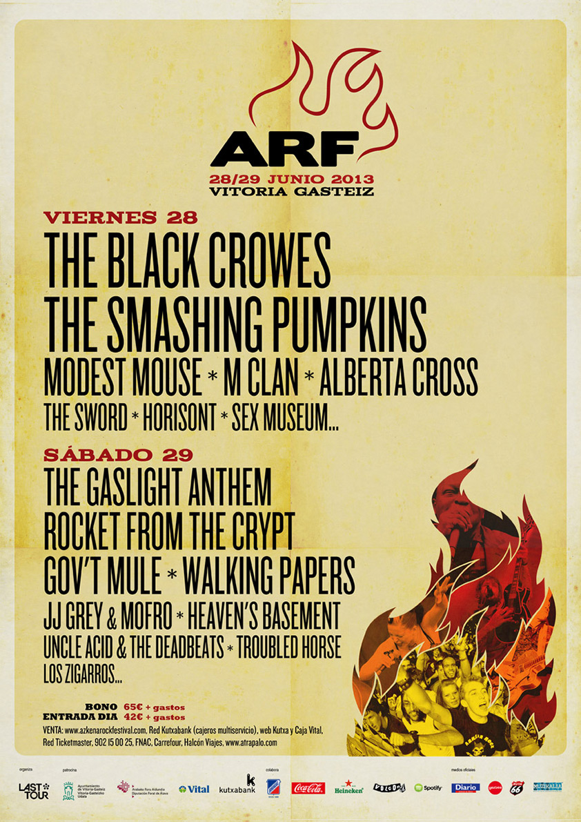 A falta de anunciar las tres últimas incorporaciones el Azkena Rock Festival 2013, con las confirmaciones de The Black Crowes (única fechas en España), The Smashing Pumpkins, Gov’t Mule, Modest Mouse, Rocket From The Crypt, M-Clan, Alberta Cross y The Sword, el festival regresa a su fórmula original enla que ninguna actuación se solape con otra, en dos escenerios, prescindiendo del tercer escenario que se venía utilizando.