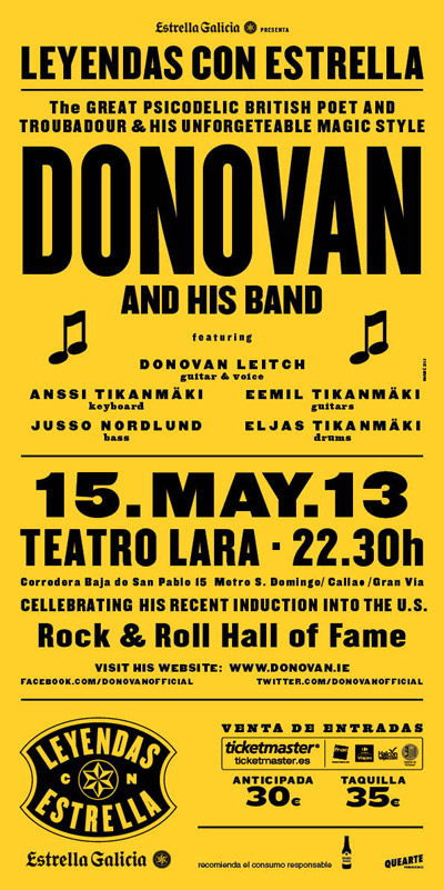 Donovan, una de los grandes figuras de la música popular como cantante Folk a mediados de los años 60, ofrecerá tres conciertos en España, el Teatro Lara de Madrid el
