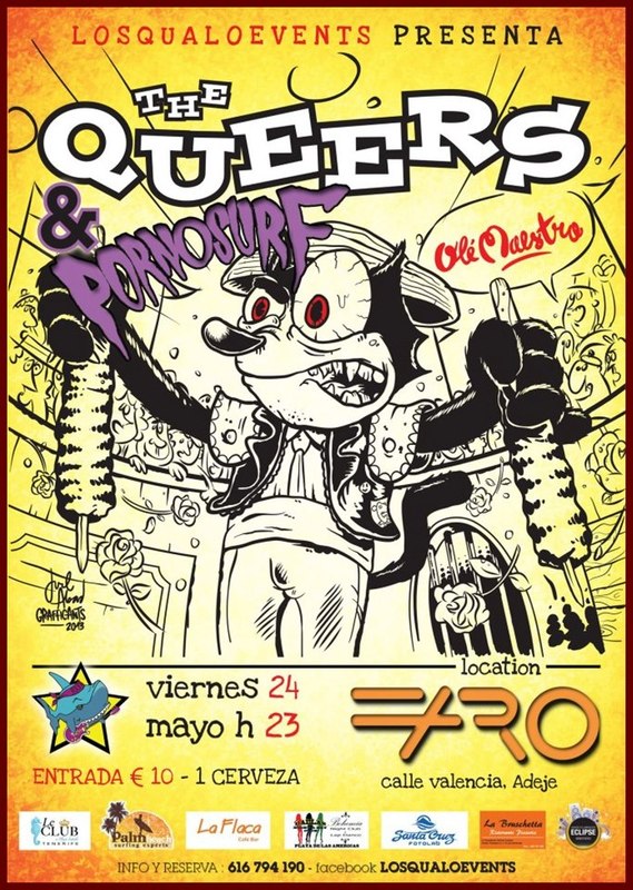 The Queers estarán acompañados en Canarias por los fenomenales Pornosurf, los días 23 y 24 de mayo, en Gran Canaria y en Tenerife, el Faro Chill Out, en el municipio de Adeje, Tenerife, a eso de las 11 de la noche, teloneados por la banda canaria “PornoSurf” de la mano de LoSqualo Events, empresa de eventos que con este concierto se lanza, a lo grande, al mundo de la promoción musical.
