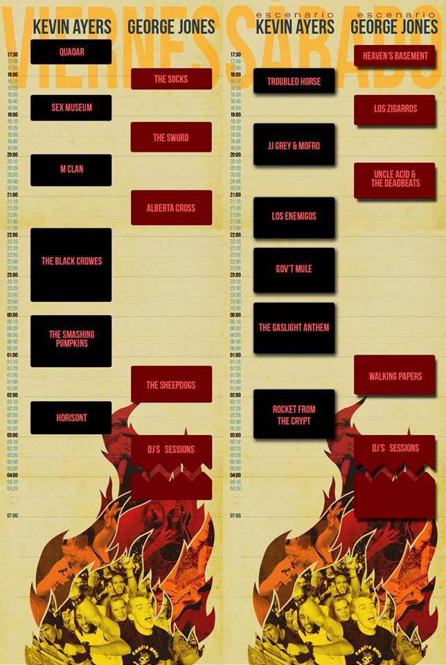 El festival cuenta definitivamente con los siguientes nombres The Black Crowes, The Smashing Pumpkins, Gov’t Mule, The Sheepdogs, Los Enemigos, JJ Grey & Mofro, Quaoar y The Socks Rocket From The Crypt, Alberta Cross, The Sword, M-Clan, Uncle Acid & The Deadbeats, Walking Papers, Sex Museum, The Gaslight Anthem, Heaven’s Basement, Troubled Horse, Horisont y Los Zigarros.