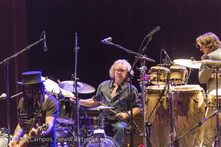 Al fin, a las nueve y cuarto de la noche, con un cuarto de hora de retraso, sale la banda a escena. Un potente batería y un sólido percusionista, un bajista que sustenta el ritmo con elegancia, dos teclados poderosos y dos guitarristas brillantes que se reparten los tiempos de lucimiento y sorprenden en sus duetos virtuosos.