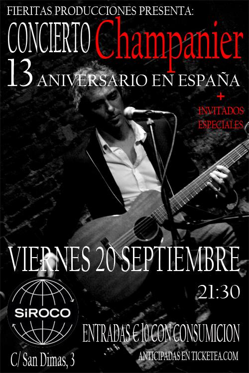 Marcelo Champanier y su concierto denominado “13 aniversario de Marcelo Champanier en España”, será su último concierto en España, antes de partir hacia Argentina para una nueva gira durante los meses de noviembre y diciembre teniendo de invitados a Claudio Gabis y Ariel Rot.