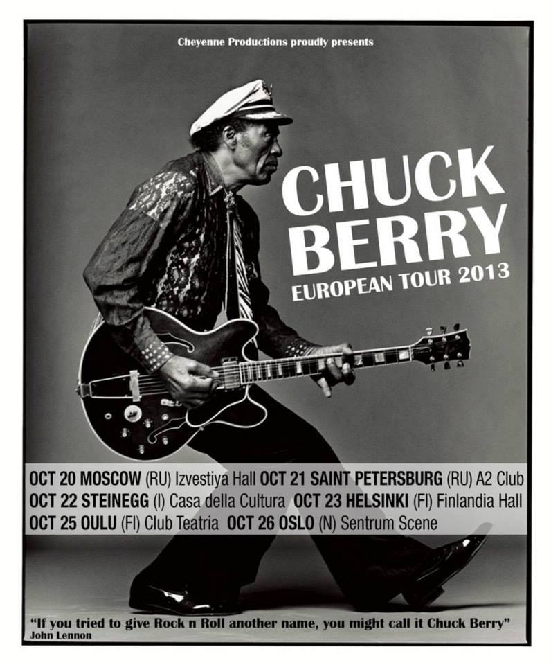 Chuck Berry para celebrar su 87 aniversario regresa a Europa con una gira que lo llevará por Italia, Noruega, Rusia, y Finlandia del 20 de octubre hasta el 26.