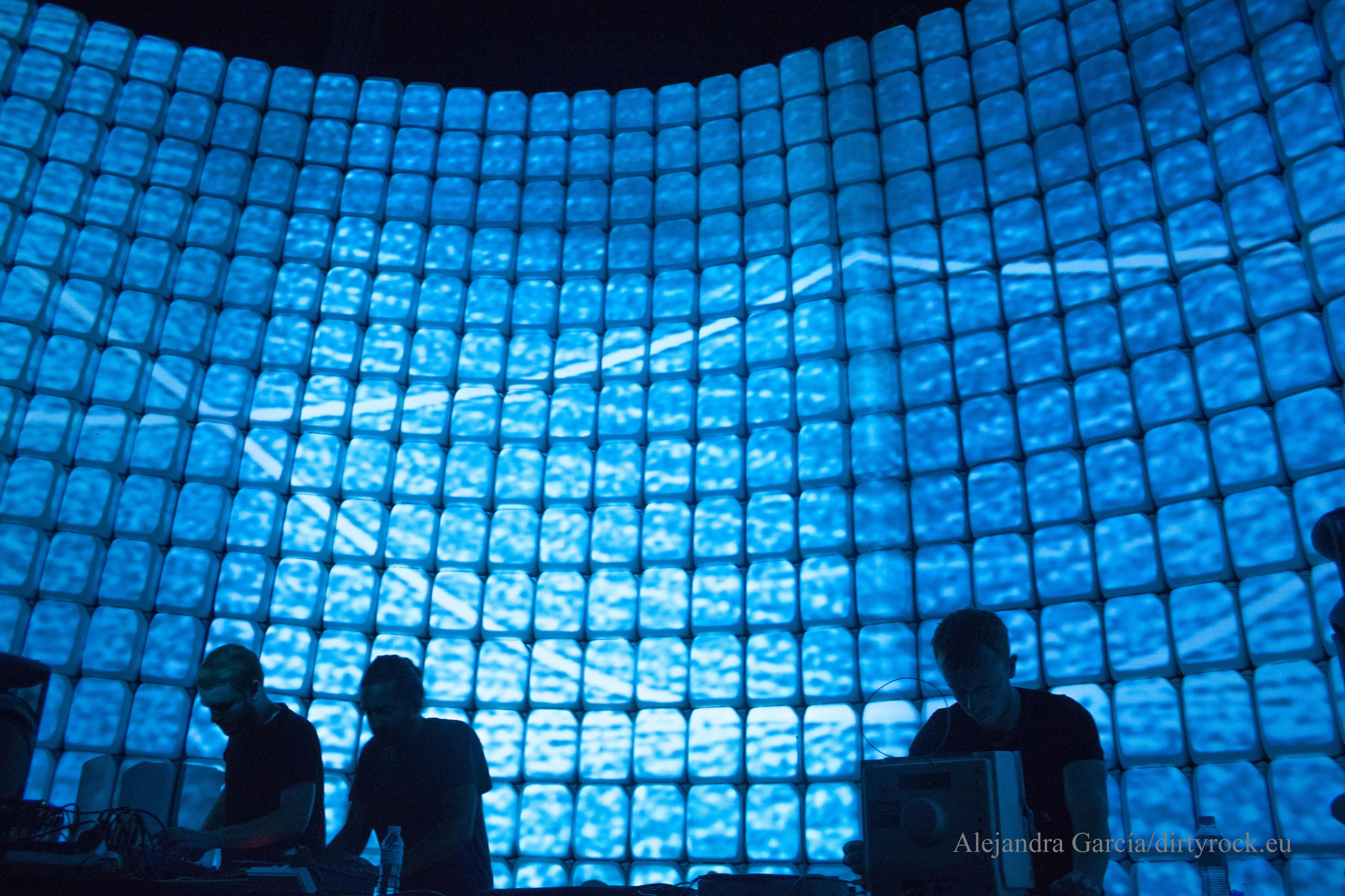 La noche llegaba casi a su fin con los tan esperados EMPTYSET que terminaron de enardecer la calidad del cartel. El dúo de Bristol, híbrido investigador de la línea que separa la música del noise, terminó de enloquecernos con su mística demiúrgica y sus estructuras arquitectónicas de sonido que se puede palpar porque son increíblemente físicas y rudas. Los keroxenianos casi podíamos lamer las vibraciones de un sonido tan expansivo como el de Emptyset, estando a poco más de un metro de su mesa de mezclas. Incluso los más tímidos se dejaron llevar con una actitud sorprendentemente receptiva. Nos entregamos a ellos y devoramos su propuesta multisensorial, a base de electrónica que amplifica texturas sonoras deconstruidas y conceptos visuales, dónde se percibía, además de una esencia auténtica y refinada, muchas tablas. Los más obscenos nos quedamos con ganas de que nos sangraran los oídos; la propuesta del dúo y el espacio del tanque así lo exigían, pero echamos de menos ésa catarsis acústica. Faltó el volumen extremo que es capaz de removernos cada rincón de las entrañas y con el que tanto se disfruta del sonido emptysetiano en unos buenos sennheiser. Aún con todo, la sincronicidad del dúo y lo sensual de sus mezclas, a cuatro manos, despertaron los instintos más primitivos. Lo dimos todo con ellos que además quedaron encantados con la ginebra macaronésica. Una experiencia impactante.