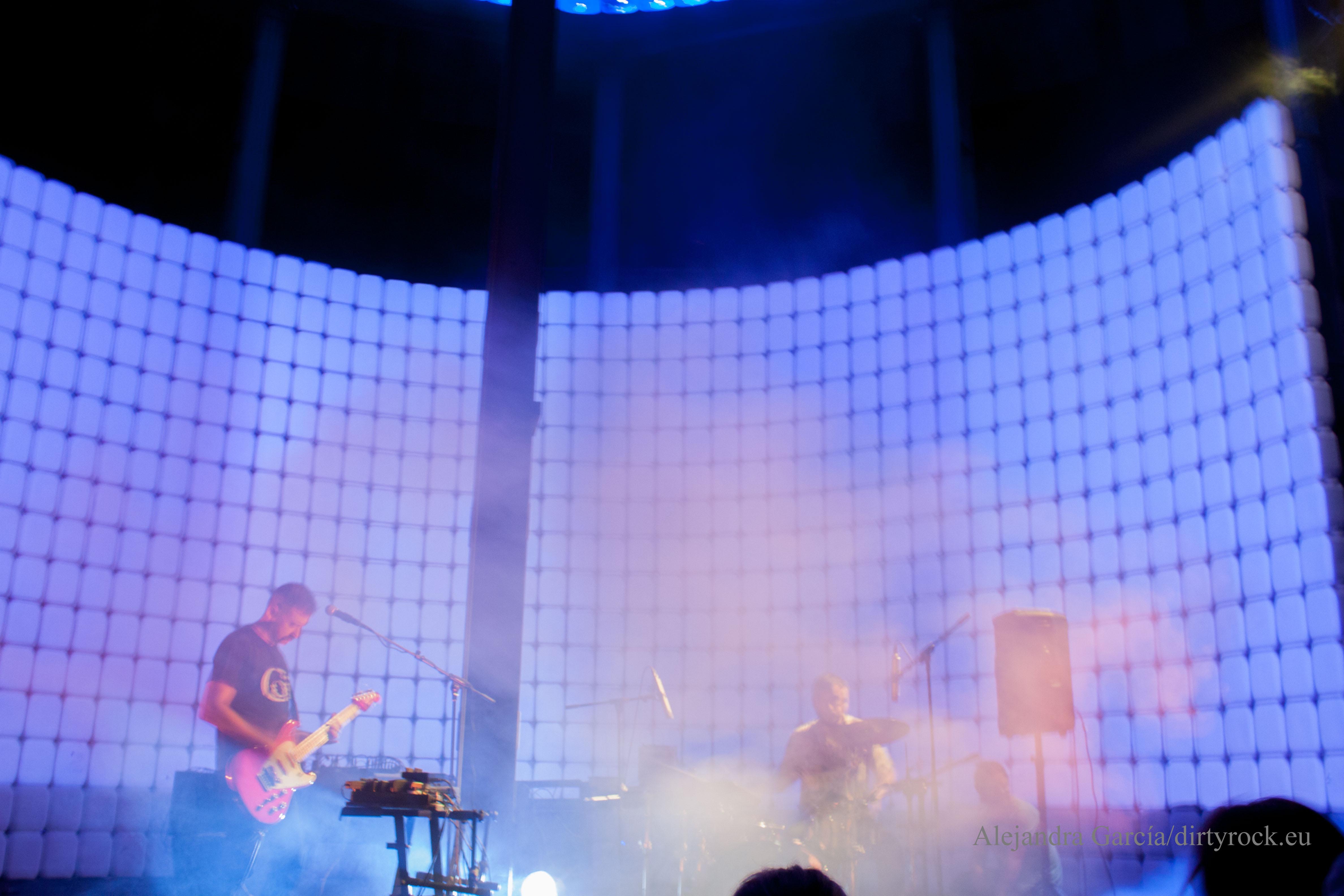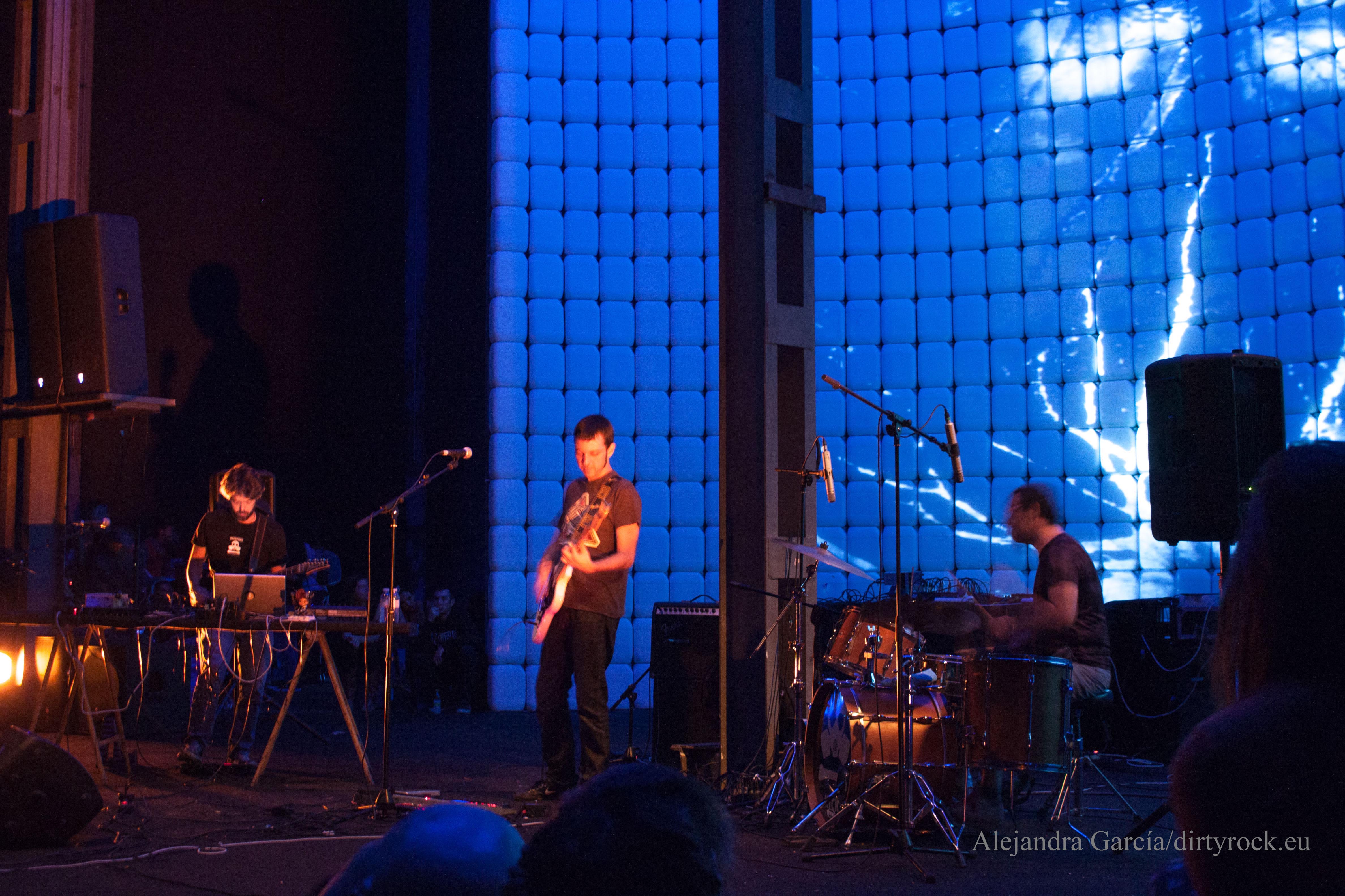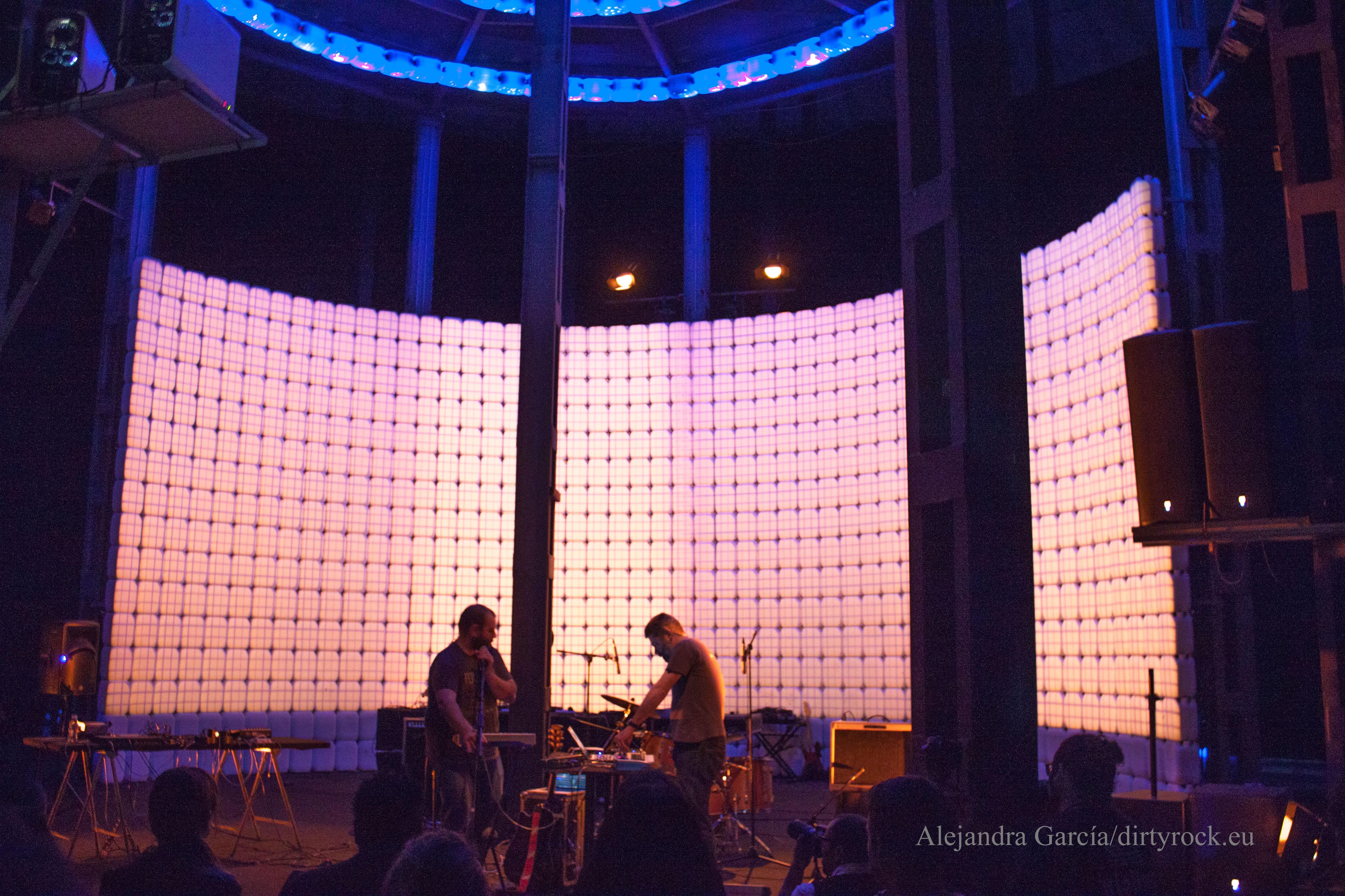 Por fin llegó el momento del dúo isleño SALÉTILE que ya nos había amenazado con la incorporación de David Perreko a la batería para hacer del conjunto de sonidos extraterrestres que les caracterizan una mezcla aún más cautivantemente insólita, cargada de resonancias que no pasarían desapercibidas. La amenaza se cumplió. Arrancaron con ciertos problemas de ecualización hasta que pidieron“por favor más base y menos guitarra”. A partir de ahí el sonido se expandió en órbitas concéntricas y loops distorsionados que encajaban con los visuales de nieve televisiva que habían escogido para la ocasión. Superadas las dificultades, el público, agradecido de que empezara el reventón de oídos que iba buscando esa noche, comenzó a levantarse, ávido de éxtasis, en ese viaje sonoro por el espacio exterior con paradas en estaciones estelares vibratorias que sólo ellos son capaces de crear. Fueron los primeros en abrir grietas en el tanque.