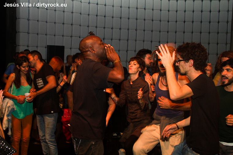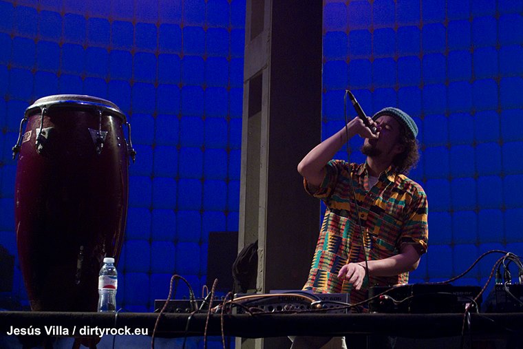 El sonido Mo Kolours nos sumergió en un trance de reminiscencias mauritanas y cubanas, mezclando segá y soul, incluso hip hop, y algún eco dub rematado con un manejo magistral de la mesa dónde se puso de relieve su destreza de club londinense. Destacó su interpretación, sus bailes pélvicos, su buen rollismo y lo bien que se tomó la intrusión de algunos acólitos que, al ver que dejaba que interactuaran con su conga, quisieron más llegando, incluso, a intentar quitarle el gorro. Ni con esa actitud tan confianzuda consiguieron robarle la sonrisa ni el talante humilde que tiene el músico. Creo que a más de uno nos entraron ganas de llevárnoslo a casa y que siguiera iluminando nuestros días con un alma tan pura como la de Mo Kolours.
