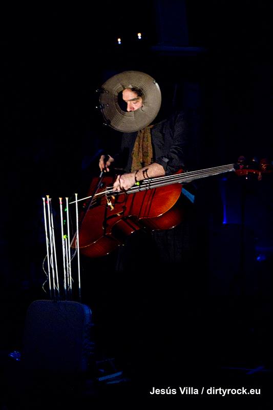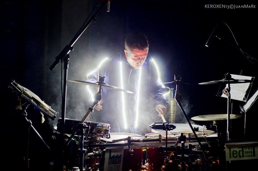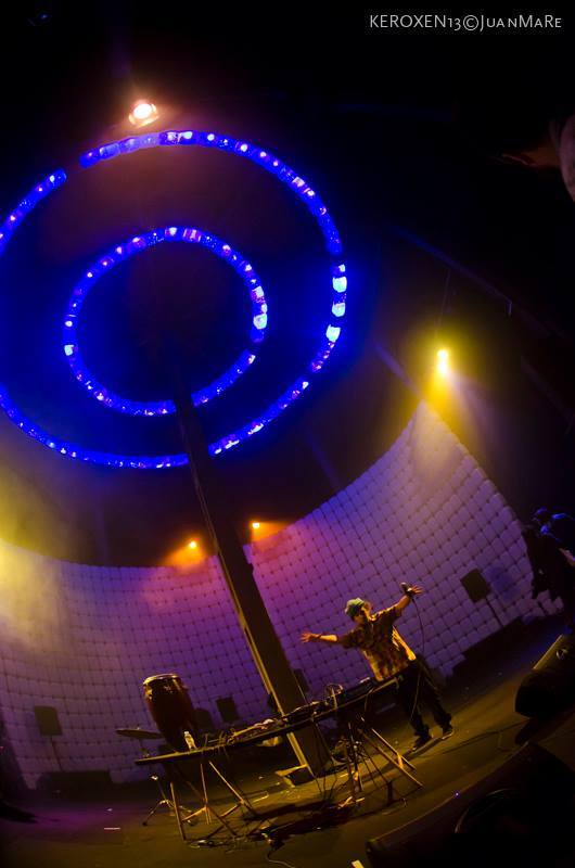 Nos sorprendió su traje de hombre rayo, decorado con luces de neón blancas, y su bombo infernal, preparado con polvos de talco, que nos transportaba al fondo de un agujero negro cada vez que lo golpeaba. Otra de las rarezas fue acariciar los instrumentos con un rastrillo. Coronó la actuación con un final explosivo en el que parecía que todos íbamos a desaparecer repentinamente en un Big Crunch. A pesar de los pocos keroxenianos que estábamos a esa hora, los aplausos se desataron demostrando que la experiencia no nos había dejado indiferentes porque fue simplemente espectacular.