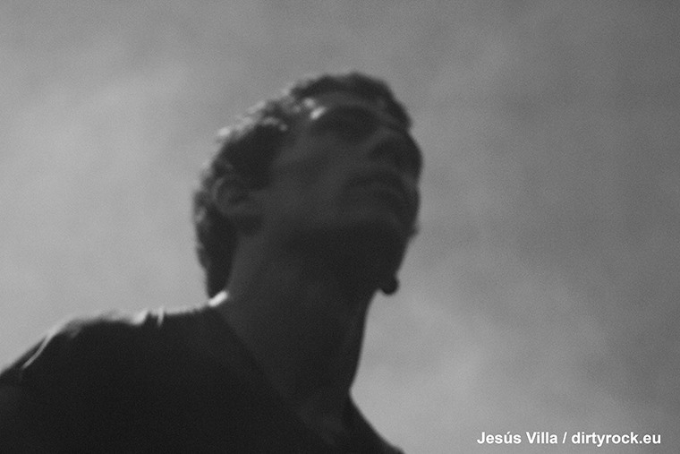 Con el primer tema “why or why not?” los keroxenianos, aún tímidos, compensaron su falta de movimiento con cálidos aplausos. Pero al ritmo del segundo tema Shapes” ya nos desfasamos. Javier nos contagió con su delirio pop, rock industrial, dark wave  y sus bases a modo de latidos sonoros que se metían por el cuerpo como sanguijuelas en busca del éxtasis que nos inundaba. Una voz desgarradoramente controlada, unos punteos de guitarra locos, unas bases y efectos hipnóticos y unos movimientos corporales que invitaban a la lujuria fueron suficientes para transformarnos en los seres infernales que queríamos ser esa noche. Con el tema “Listost” penetramos en grutas más profundas y oscuras.