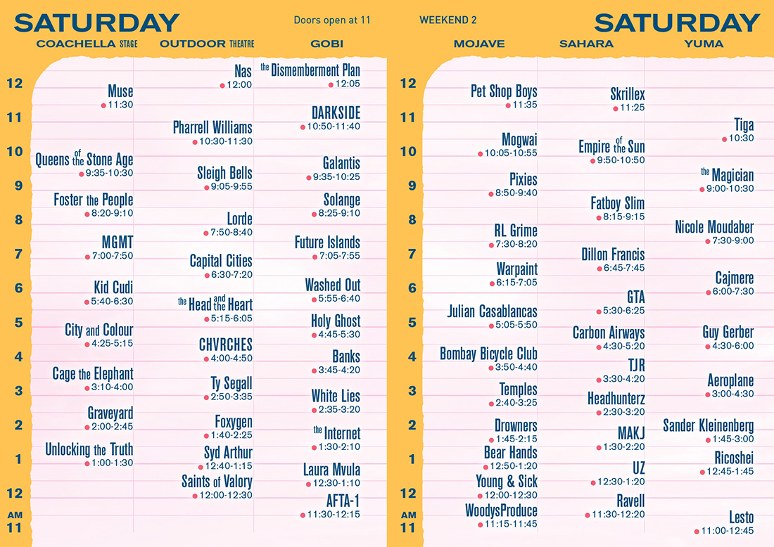 Horarios de retransmisión del festival con horas en California. Sumar 8 horas más GMT+1.