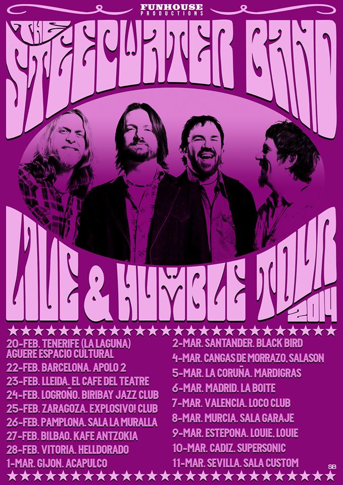 The Steepwater Band regresan a España en una nueva gira denominada “Live & Humble 2014 Tour” que abrirán en La Laguna, Tenerife (Aguere Espacio Cultural) el próximo 20 de febrero y culminarán el 11 de marzo en Sevilla (Sala Custom) para presentar su nuevo disco en directo editado el pasado diciembre de 2013 titulado “Live & Humble”.