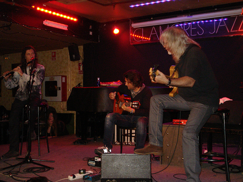 Comenzó Jorge Pardo con su flauta travesera interpretando un tema propio, dando lugar a que Carles y Josemi se acomodaran y se unieran con sus instrumentos a compartir el escenario, atentas y cómplices miradas entre los tres intérpretes percibían los cambios que pudieran acontecer. Poco tardaron en dejar solo al sr. Benavent con su bajo de cinco cuerdas y pusieran sus manos ese aire flamenco que tan complicado es ejecutarlo con este instrumento y que de muy buena manera sabe llevarlo a cabo, todo un maestro.