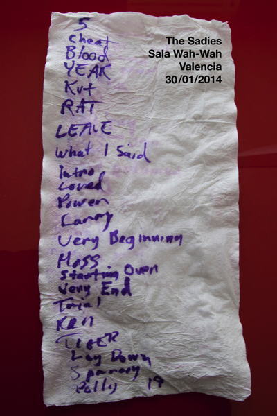 Felicidades al técnico y al local (WAH-WAH) por la acústica, magnífica, quizás debido el efecto a que el aforo no estaba completo, pese a la presencia de ilustres figuras locales como Josh Rouse, amorosamente afincado en esta nuestra bella tierra valenciana. Mezclas poco ortodoxas de estilos bañaron la actuación, que resultó francamente atractiva en muchos momentos, sobre todo debido a que la mayoría de los temas eran de -generalmente- corto tiempo y el público estaba entregado, propiciando una proximidad que se acentuaba según el grupo desgranaba sus principales éxitos: ‘So Much Blood’ o ‘Leave This World Behind’ y ‘Tiger, Tiger’ sonaron acorde con los vinilos publicados; ‘Starting all over again’ & ‘The very beginings’ justificaron su último redondo, regalándonos entremedio covers de Elvis -impagable ‘Wearin’ That Loved On Look’ (1969)- y de la extraña pareja countrybilly americana The Louvin’ Brothers, su ‘There’s a higher power’ (1959), tomado del álbum ‘Satan is Real’……. Un highball realmente imbatible. Podéis pegarle un vistazo a la lista de canciones que se acompaña a la crónica, y loar a la higiene de su rescatador, pues el documento estaba cierta y merecidamente bien sudado.