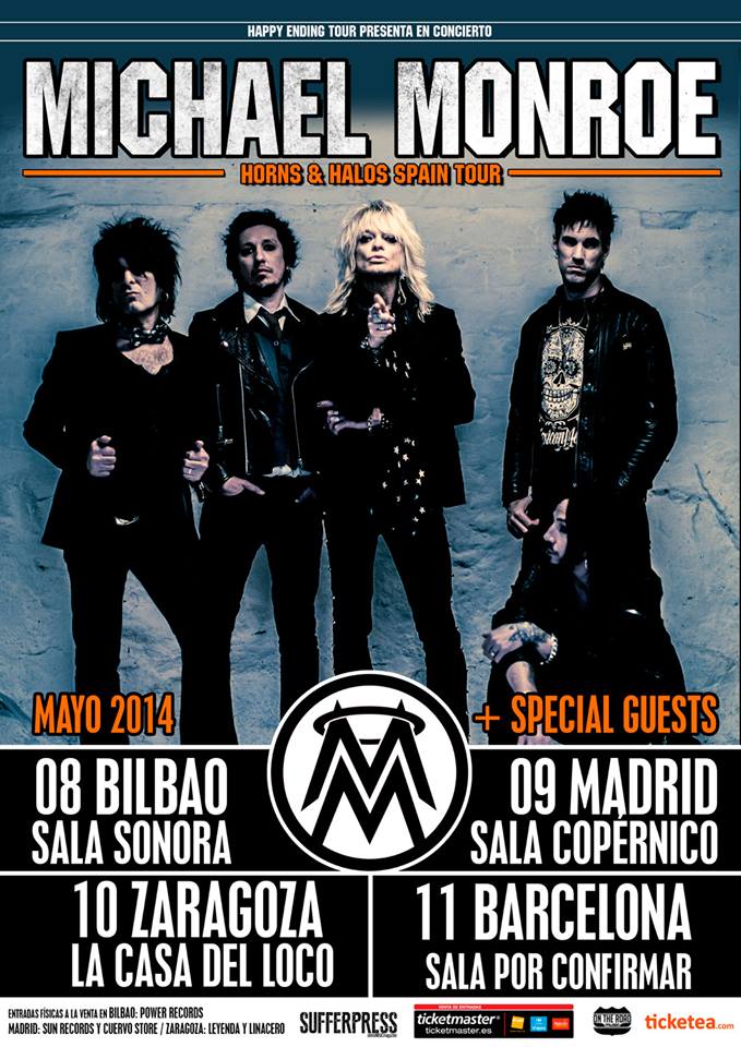 Michael Monroe (Hanoi Rocks, Demolition 23 o Jerusalem Slim) el finlandés anuncia una gira española para el próximo mes de mayo junto a su súper banda compuesta por Sami Yaffa (bajo y coros), Dregen (guitarra y coros, Karl Rockfist (batería y coros) y Steve Conte (guitarra y coros) para presentar en directo su último disco “Horns and Halos”, editado el pasado.
