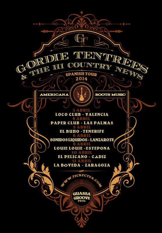 No es fácil encontrar en nuestra tierra la posibilidad de escuchar música profundamente asociada a la cultura americana. Música, que por otro lado, y en sus múltiples derivados, se escucha en todo el mundo y ha sido la base fundamental para el desarrollo de prácticamente toda la banda sonora que se escucha desde mediados del siglo XX. Pues bien, uno de los genuinos representantes de este sonido de raíces es Gordiee Tentrees y su banda, la Hill Country News, que el 3 de abril en Valencia, 4 de tocarán en la sala Paper Club de Las Palmas de Gran Canaria, el 5 en la Sala el Búho de La Laguna, el 6 en Sonidos Líquidos de Lanzarote, el 9 en Estepona, el 10 en Cádiz y el 11 en Zaragoza. https://youtu.be/_u3g1Gp-L_Q El grupo lo constituyen Gordie Tentrees (porchboard bajo, dobro, armónica, guitarra y voces), Fabian Brook (violín, guitarra) y Aiden Tentrees (contrabajo). Es un buen momento para hablar con Gordie Tentrees. Fechas de la gira española de Gordie Tentrees y Hill Country News: