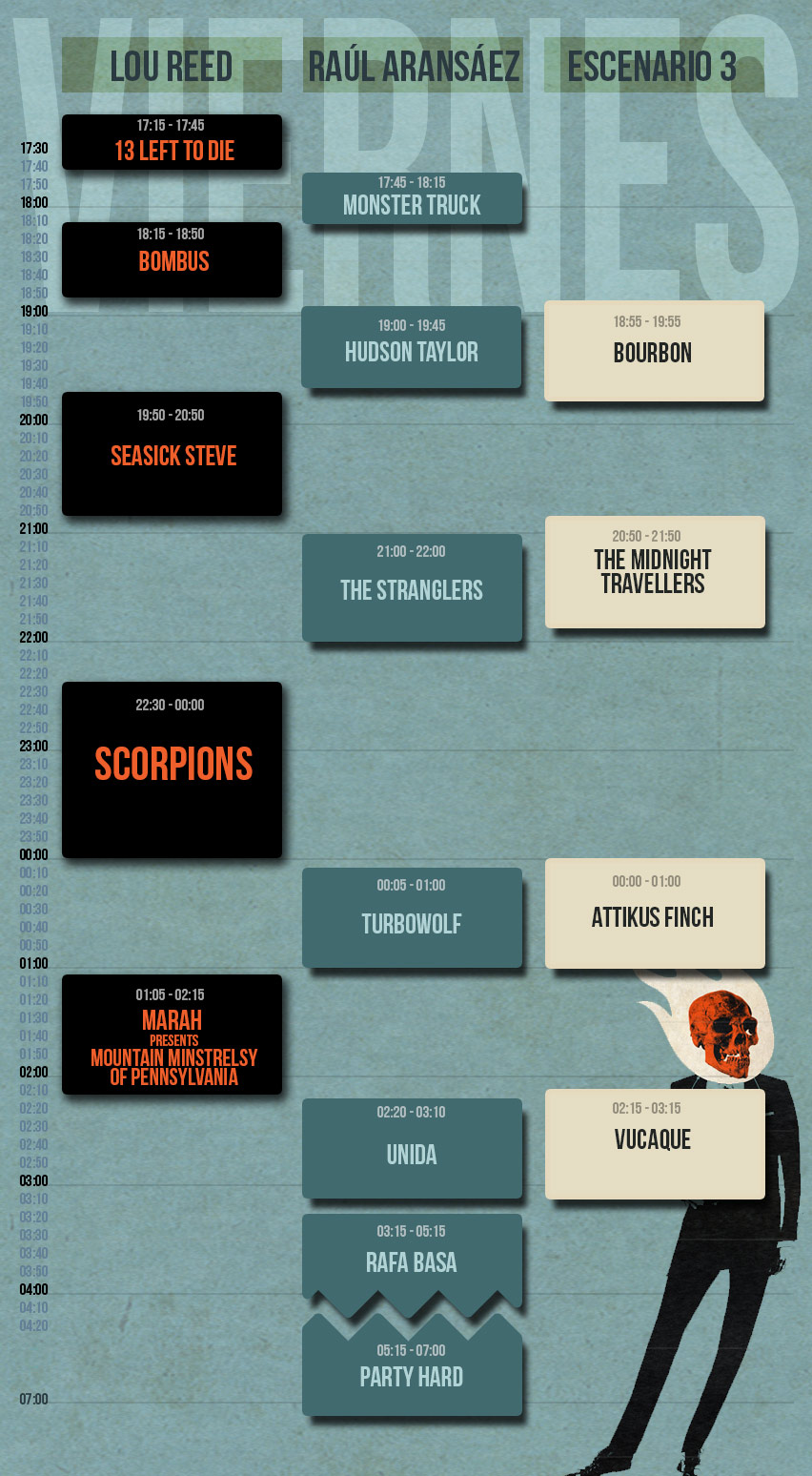 La decimotercera edición del Azkena Rock Festival 2014 confirma los horarios y adjudicación de escenarios a artistas y bandas que participarán en esta edición del 2014 distribuidos en tres escenarios llamados Lou Reed, Raúl Aransáez, guitarrista y fundador de la banda local Reverendo Parker, fallecido en agosto de 2013, y un tercer escenario destinado a formaciones nacionales.