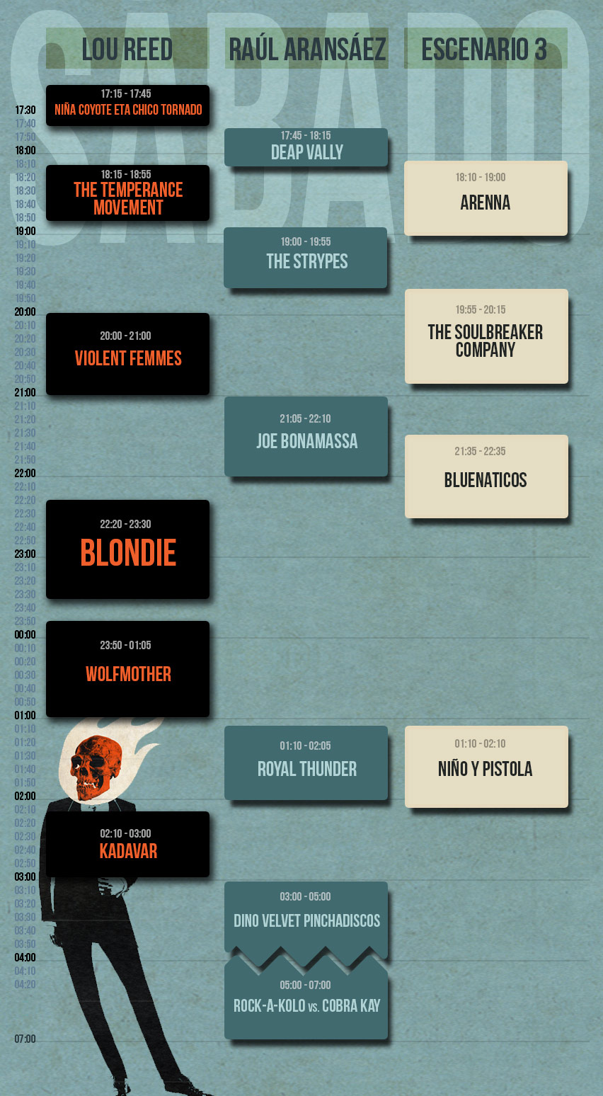 Mientras que Violent Femmes (20.00 horas), Joe Bonamassa (21.05 horas), Blondie (22.20 horas) y Wolfmother (23.50 horas) serán los cabezas de cartel del sábado 21 de junio de 2014 en el Azkena Rock Festival.