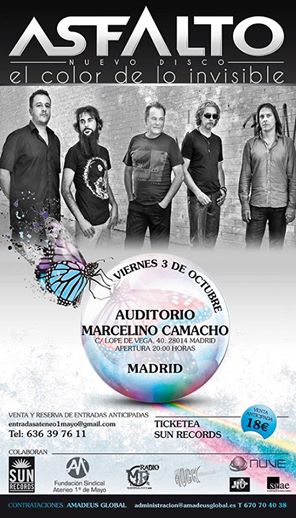 Asfalto la legendaria banda madrileña que realzó el rock urbano junto a Leño, Topo, Ñu, Mermelada, Cucharada…. celebran su cuarenta aniversario con nuevo lanzamiento discográfico. “El Color de lo Invisible” es el título de su trabajo que será presentado el próximo 11 de Septiembre por ración doble, uno por la mañana para medios en la SGAE y otro por la tarde en la sala We Rock de Madrid donde se celebrará una fiesta-concierto con la banda al completo dando cabida a todos los éxitos de la banda.