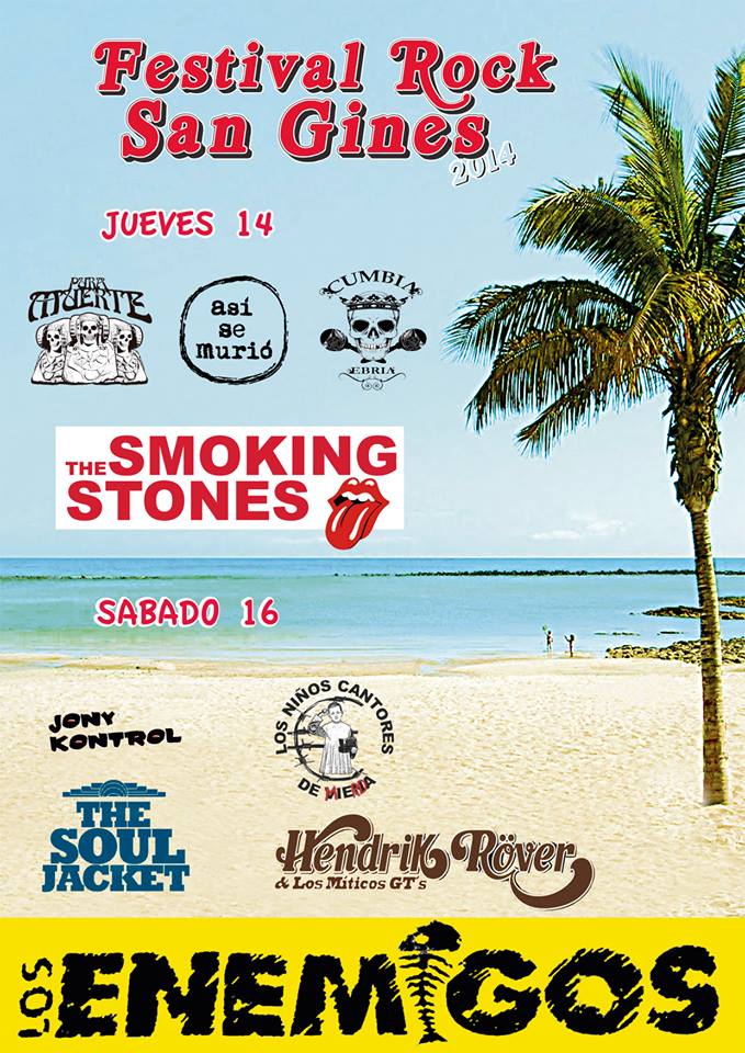 El festival de Rock San Ginés 2014 que se celebra en el Parque Islas Canarias de Arrecife en Lanzarote anuncia un cartel realmente extraordinario con las bandas Los Enemigos, Hendrik Röver y Los Míticos GT, The Soul Jacket y Smoking Stones como grandes cabezas de cartel más Pura Muerte desde Madrid, Cumbia Ebria de Lanzarote, así se murió de Gran Canaria, Jony Kontrol desde Bilbao y Los Niños Cantores de Mierda desde Tenerife dentro del programa de las Fiestas de San Ginés de la isla conejera para los días 14 y 16 de agosto de 2014, hasta el momento el mejor festival de Rock celebrado en Canarias este año por nombres.