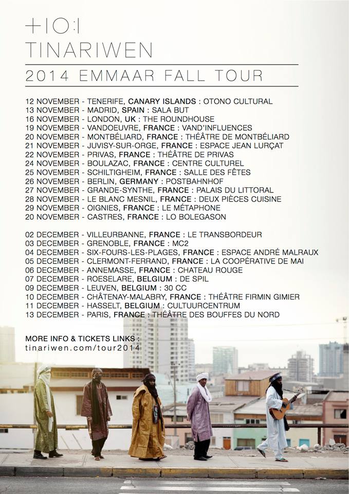Tinariwen confirman conciertos el 12 de noviembre en Santa Cruz de Tenerife (ciclo otoño cultural fundación cajacanarias) y el 13 en  Madrid (Sala But) para su nueva gira de otoño “Emaar Fall Tour 2014”, abriendo la gira europea “Emaar Fall Tour 2014” de esta magnífica banda Blues y Rock polvoriento de Mali compuesta por ex soldados Tuareg que presentan “Emaar” su último y soberbio trabajo de los llamados Rolling Stones del desierto o The Rolling Stones del Sahara.