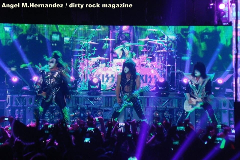 Una gran cortina con el logo de Kiss ponía los pelos de punta a los que por primera vez iban a ver a Kiss…. música de fondo “Good Times Bad Times” de Led Zeppellin… y la locura se desató cuando la cortina se vino a bajo y salieron El Demonio, El Chico Estrella, El Hombre Gato y El Hombre Espacial, fuego, petardos y demás artificios inauguraban la gran ceremonia del rock con “Detroit Rock City” seguido de “Deuce”, “Psycho Circus”, “Creatures of the Nigth”….todo el palacio entregado, tanto abajo en la pista como en las gradas y es que la teatralidad de esta formación mantiene viva toda la atención en todo el trascurso del concierto, cualquier intento por ir al baño o a pillar una cerveza te puede dejar sin ver a Gene Simmons escupiendo fuego.
