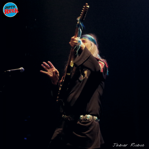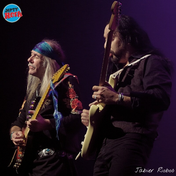 “Just another Rainbow” de Electric Sun o “We´ll Burn the Sky” como seda sonó a gloria con un apoteósico dúo de guitarras, la banda dirigida por el maestro nos llevaba a la memoria muchos años atrás, a nuestra adolescencia para muchos de los presentes, “In Trance” sonaba a bálsamo, se cantó y gritó a coro, Uli y Luca en armonía los vellos de aquella manera y es que esto es un tema grabado a fuego en mis neuronas, aplausos unánimes del respetable que colmaba el CICCA, “Fly to the Rainbow” estratosférica cargada de efectos junto con un preludio impresionante con la Sky guitar de ocho cuerdas a cargo del maestro al que se fueron sumando sus pupilos en un arco iris de matices clásicos e incluso con aromas flamencos de los que Uli Jon Roth mamó en su juventud, “I´ve got to be Free” alargada a ritmo de palmas y fraseos, en comunión con el publico el vocalista Piero efectivo y simpático haciéndonos cantar, luego solo de Luca Poma que estuvo sobresaliente todo el bolo, quedada de bajo y batería demostrando los transalpinos su valía, faltaban trallazos como “Dark Lady” en el que Uli volvió a demostrarnos que su voz persiste en buenas condiciones, para rizar el rizo cayeron “All along the Wachtower” del Nobel Dylan elevada a la máxima potencia por Jimi Hendrix que no podía faltar en la cita del maestro marcándose un “Little Wing” magnifico y emotivo. Bolo de pódium de lo visto este año en la isla, tres veces he visto a Scorpions en diferentes décadas, no creo que vuelva a verlos, pero la muesca del maestro, heredero del zurdo faltaba en mi revolver, aquellos cinco discos dejaron huella, marcaron época, por eso lo ineludible de la cita. ¡¡¡ Salud compañeros !!!