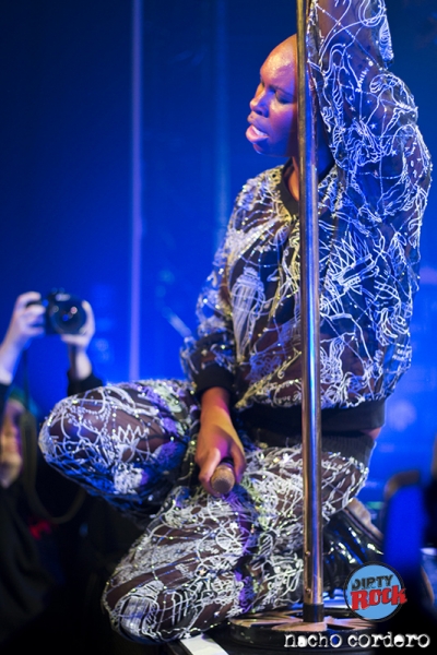 Pero si en los antiguos discos de Skunk Anansie la eléctrónica tenía un papel secundario como nexo entre los temas a modo de introducciones o ambientaciones pero en esta nueva encarnación de la banda cobra un papel algo más protagonista como apreciaremos en Love Someone Else donde la cantante ataviada con una chaqueta reflectante bailará entre lineas de láser rojo que destellarán por toda la sala en una magnífica puesta en escena. Será una de las pocas concesiones a estos sonidos en una noche en la que los sonidos más duros serán protagonistas con una gran presencia de los bajos que hacen que toda la sala vibre y también algo dentro de los allí presentes a cada golpe de Mark al bombo de su enorme batería y a cada nota que sale de las cuerdas rojas del bajo de Cass.