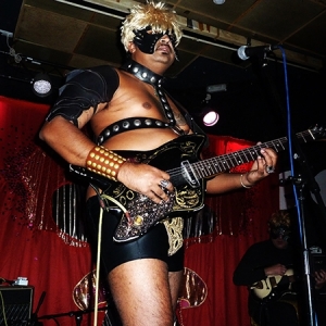 Unos carajillos de Terry sin quemar, y a probar sonido, cosa que a King Khan le llevó minuto y medio. Tres minutos para extender la cortina roja de raso y lamé a modo de telón de fondo, y poco más para cambiar sus discretas ropas de calle por los habituales ropajes de estilismo friqui: máscaras y pelucas rubias, transparencias, mucho cuero de imitación y tachuelas, botas de cowboy. No es que sea indescriptible pero en este caso las imágenes nos ahorran palabras. A partir de ahí el delirio, que empezó con los primeros rasgueos de las guitarras.
