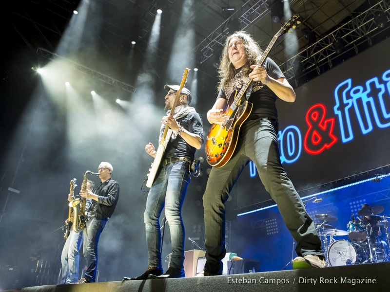Caricatura de Fito calaverizado en las nítidas pantallas conduciendo hacia un cementerio donde encuentra a sus compañeros…. y zas…. arranca el show. “Siempre estoy soñando” con su rasgueo solitario enfervoriza el recinto, la mecha está encendida, así lo corrobora “Un buen castigo” uno de esos temas redondos, “Por la boca vive el pez” y “Me equivocaría otra vez” donde ya el bolo iba sobre ruedas con el sonido perfecto. Javier Alzola (saxo, coros y percusiones) no ha cambiado un ápice (quizás las canas) desde aquel “txamizo” en Galdakao donde ensayaba con su banda de jazz, Alejandro Climent (bajo y coros), Carlos Raya (guitarra, coros) nos mostró un catalogo de preciosas hachas que maneja a la perfección, y es que tiene sangre azul, junto a Dani Griffin (batería) forman una banda compacta y sin fisuras en directo. Dieron un repaso a toda la discografía exceptuando “Los Sueños Locos”, tocaron “Todo a cien” de La Cabra Mecanica, y Muchachito subió de nuevo al escenario para acompañar a Fito en “No soy Bo Diddley” y su tema “Me tienes frito”. Una agradable sorpresa fue “Entre dos mares” de Platero y Tú, el recinto era una olla a presión que no dejó de bullir en ningún momento llegando a explotar con los dos bises “Rojitas las orejas”, “Soldadito Marinero” y “Entre la espada y la pared” y “Acabo de llegar” después de más de dos horas. Sonrisas de oreja a oreja y sudor, y es que Fito & Fitipaldis son rock intergeneracional, padres, hijos y nietos se fueron satisfechos y así ocurrirá en el resto de las 20 ciudades y 25 fechas de esta gira. 20 años y los que quedan…esperamos el bocata de queso “le supo” a Fito como se dice por estos lares.