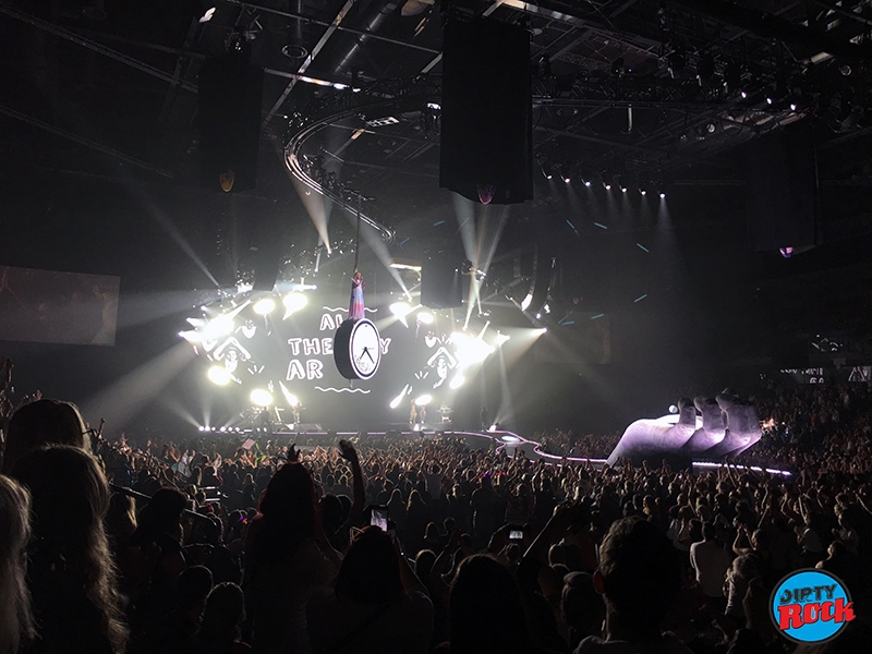 Una majestuosa imagen de una cornea animada que nos miraba a todos era una impactante visión. Nos observaba a las 11.000 personas expectantes por la salida de la artista. ¿Qué hago yo aquí? pensaba yo. Esa pantalla gigante detrás del escenario fue un lugar mágico toda la noche, lleno de videojuegos, seres fantásticos, planetas y canchas de baloncesto.